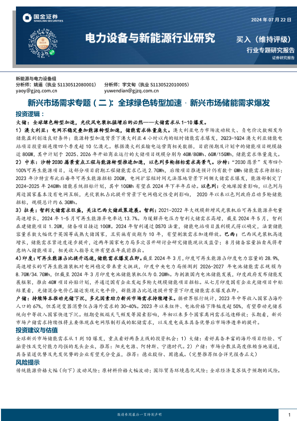 【国金证券】【20240722】电力设备与新能源行业新兴市场需求专题(二):全球绿色转型加速,新兴市场储能需求爆发-28页