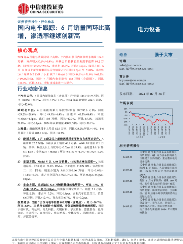 【中信建投证券】【20240724】电力设备行业国内电车跟踪:6月销量同环比高增,渗透率继续创新高-15页