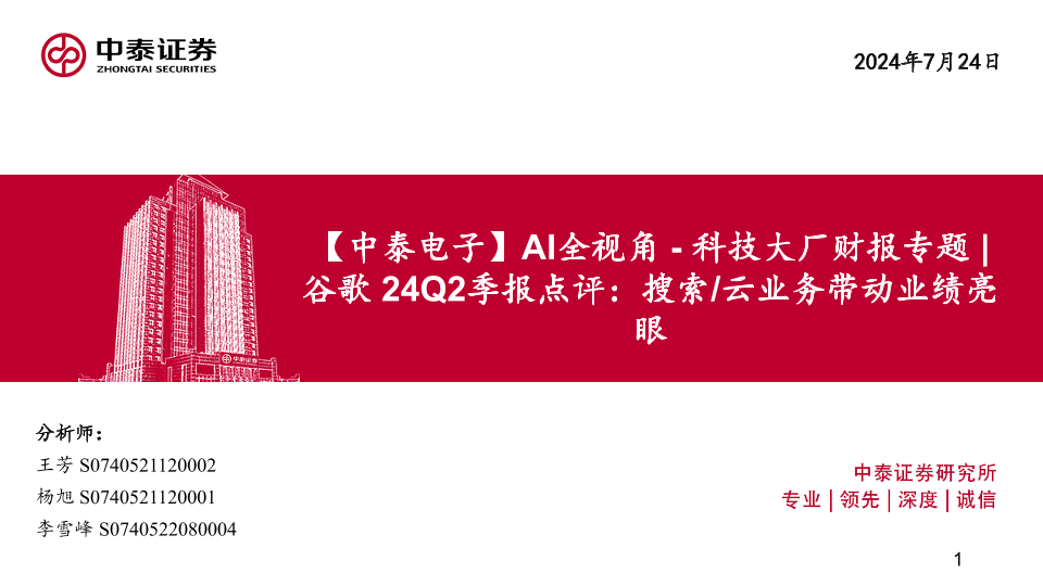 【中泰证券】【20240724】电子行业AI全视角:科技大厂财报专题|谷歌24Q2季报点评,搜索/云业务带动业绩亮眼-27页