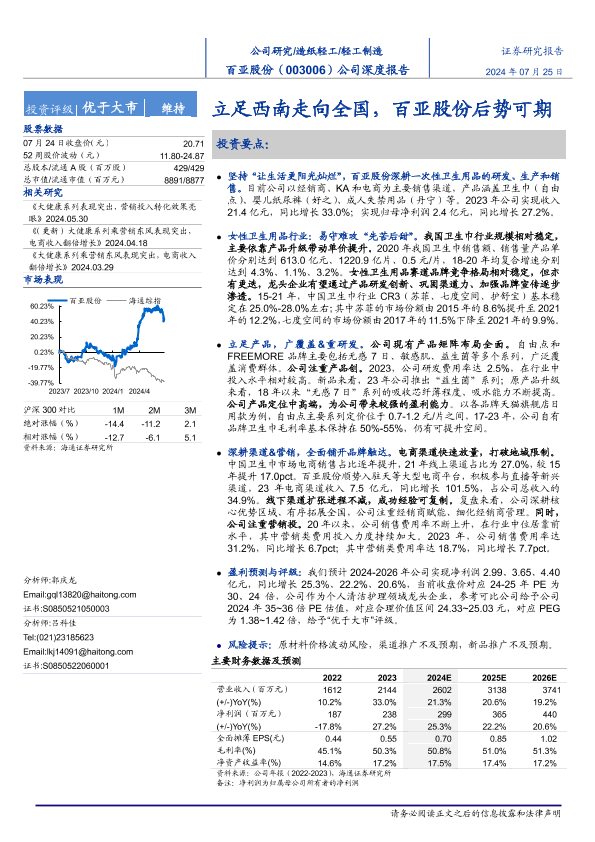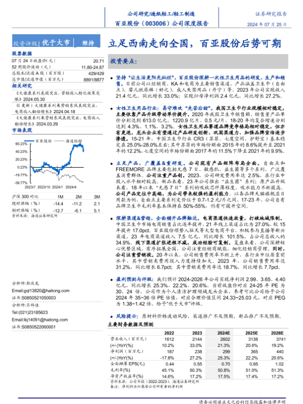 【海通证券】【20240725】百亚股份(003006)公司深度报告:立足西南走向全国,百亚股份后势可期-21页