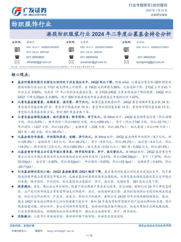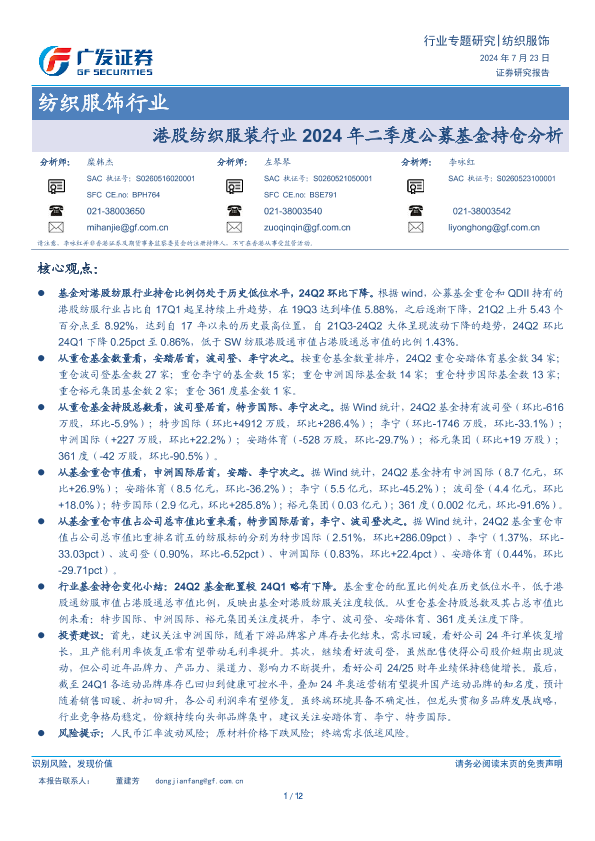【广发证券】【20240723】港股纺织服装行业2024年二季度公募基金持仓分析-12页