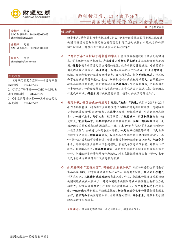 关税影响 出口展望 美国大选 行业分析 贸易政策