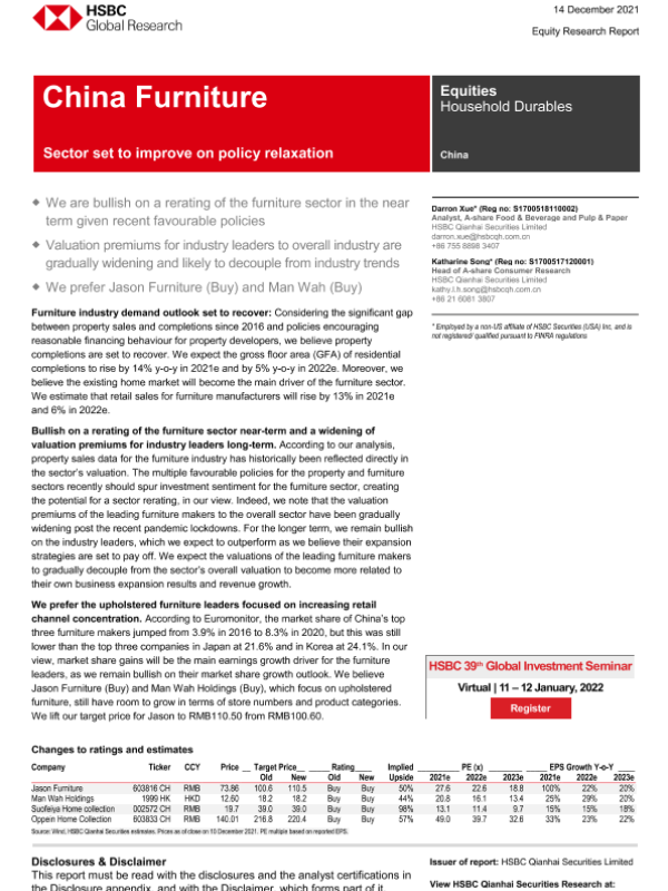 【HSBC Qianhai Securities Limited】【20211214】HSBC-中国家具行业-业界将改善放宽政策-23页