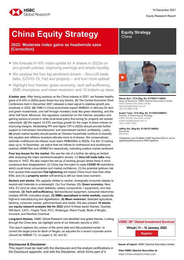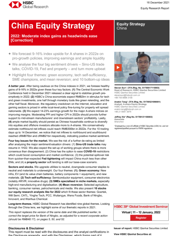 【HSBC Qianhai Securities Limited】【20211216】HSBC-中国投资策略-2022年:阻力缓解,指数温和上涨-57页