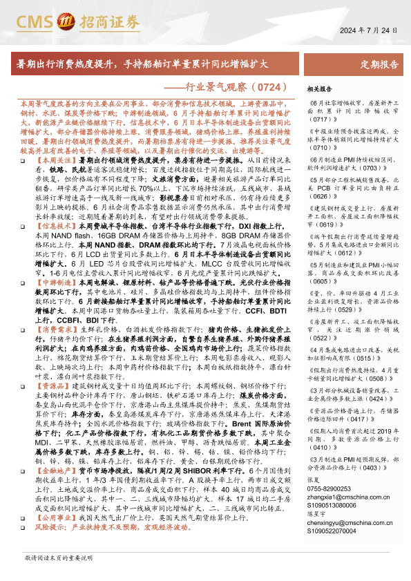 【海通证券】【20240724】行业景气观察:暑期出行消费热度提升,手持船舶订单量累计同比增幅扩大-33页
