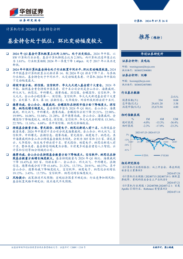 【华创证券】【20240726】计算机行业2024H1基金持仓分析:基金持仓处于低位,环比变动幅度较大-10页