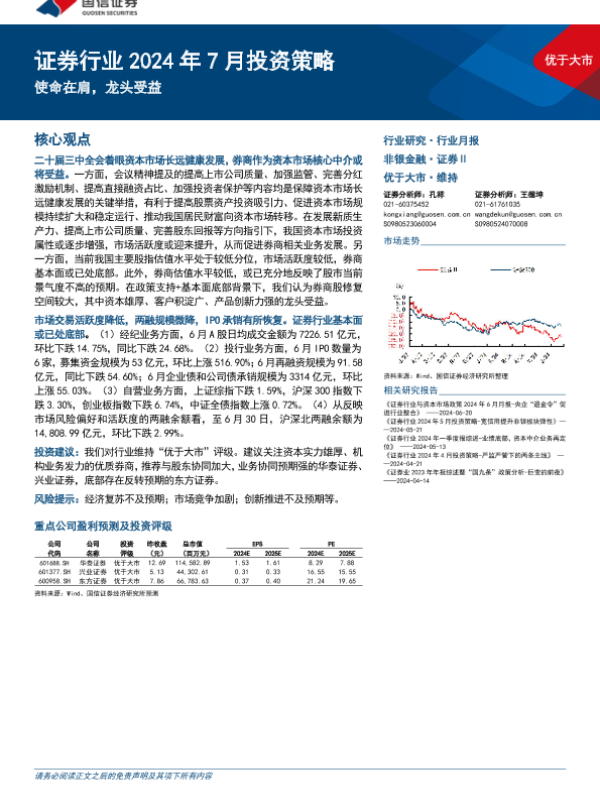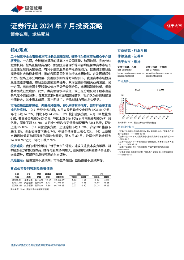 【国信证券】【20240724】证券行业2024年7月投资策略:使命在肩,龙头受益-13页