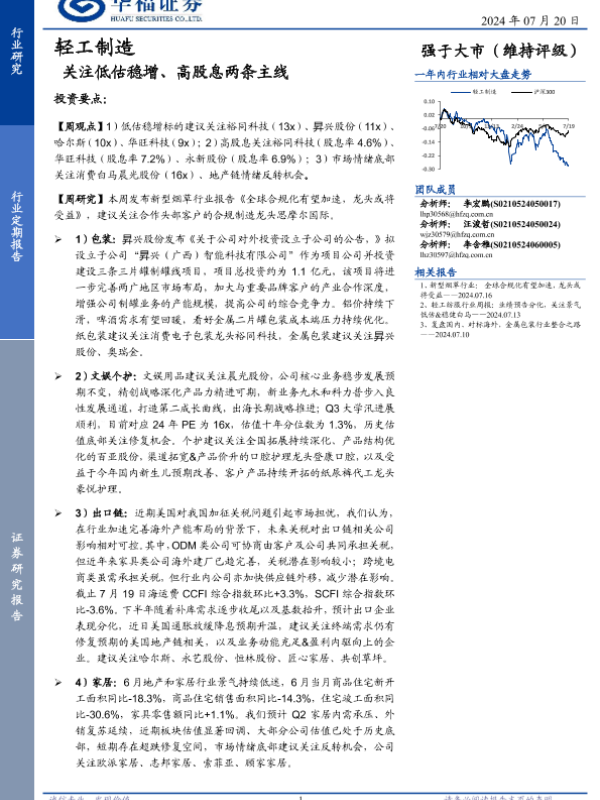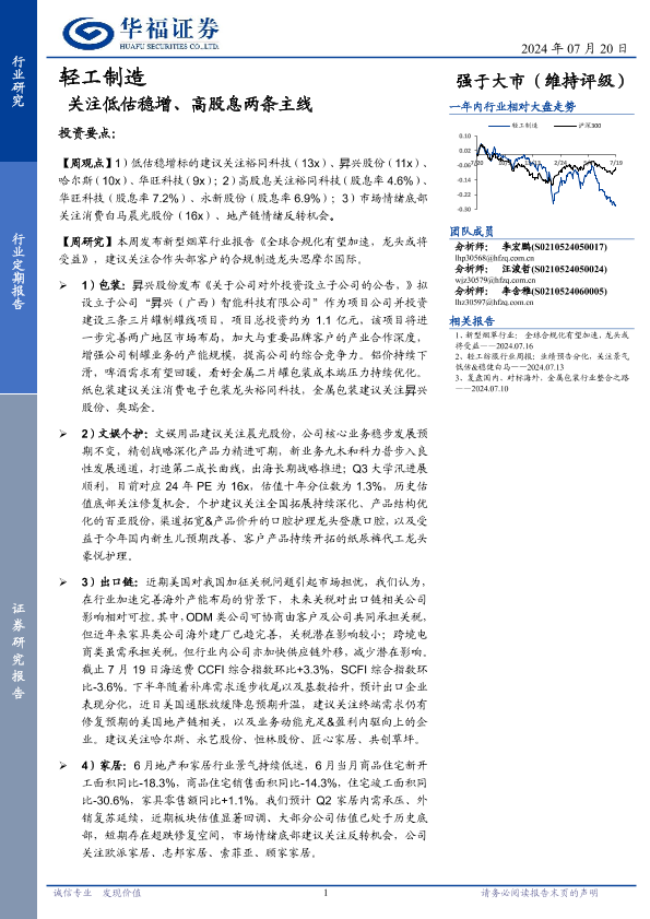【华福证券】【20240720】轻工制造行业定期报告:关注低估稳增、高股息两条主线-22页