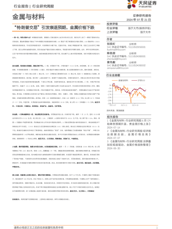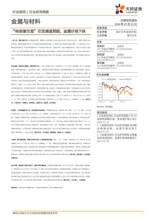【天风证券】【20240721】金属与材料行业报告:“特朗普交易”引发衰退预期,金属价格下跌-16页