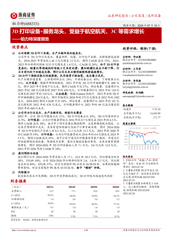 【浙商证券】【20240718】铂力特深度报告:3D打印设备+服务龙头,受益于航空航天、3C等需求增长-44页