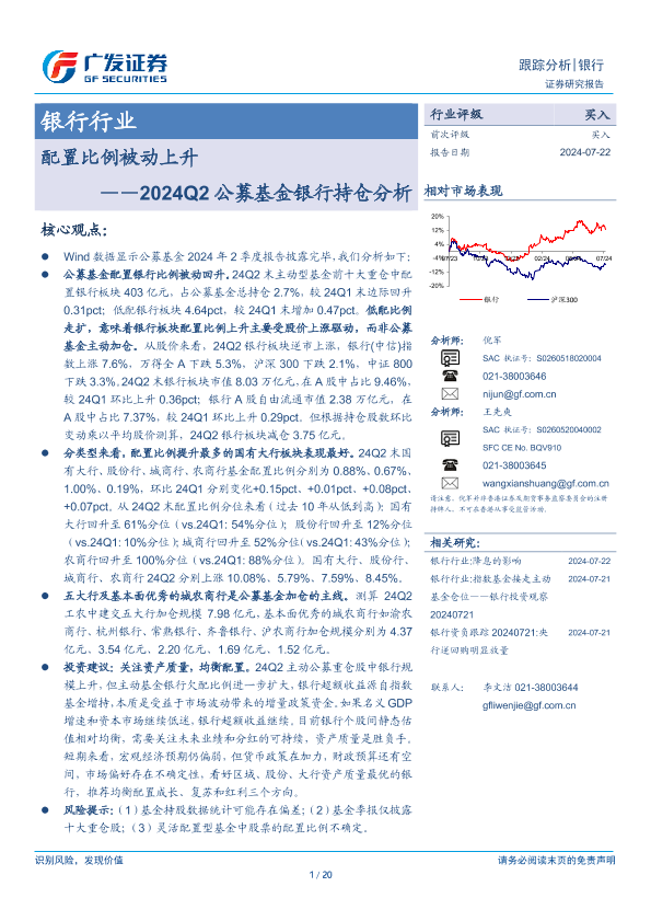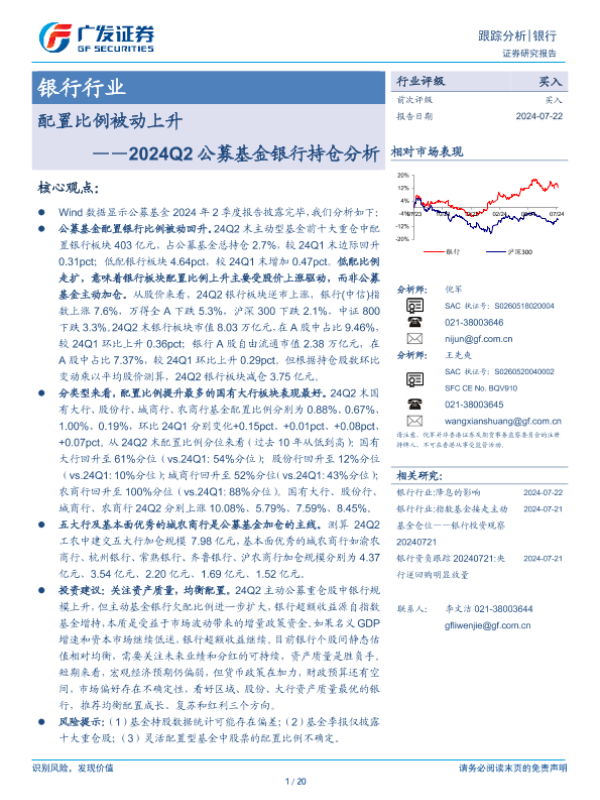 【广发证券】【20240722】银行行业2024Q2公募基金银行持仓分析:配置比例被动上升-20页