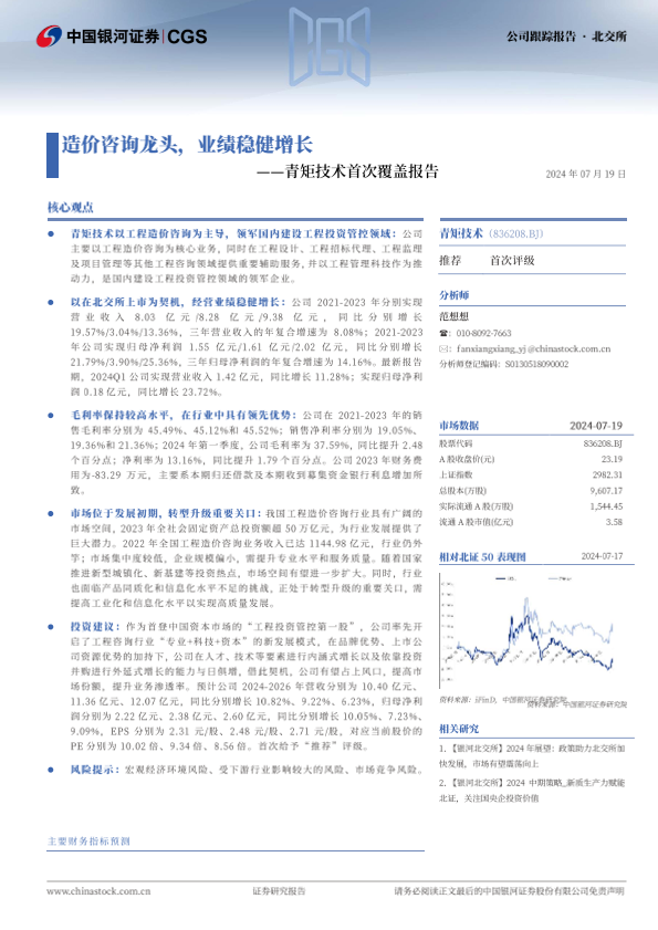 【银河证券】【20240719】青矩技术(836208)首次覆盖报告:造价咨询龙头,业绩稳健增长-14页