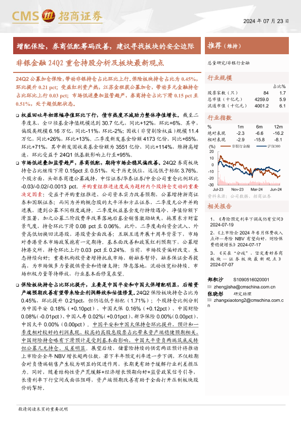 【海通证券】【20240723】非银金融行业24Q2重仓持股分析及板块最新观点:增配保险,券商低配筹码改善,建议寻找板块的安全边际-14页
