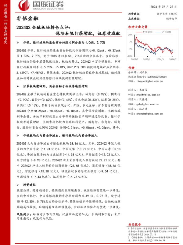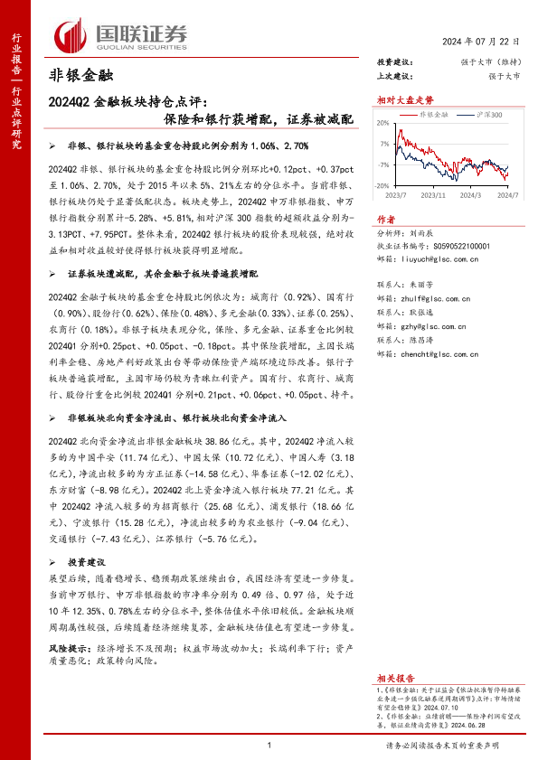 【国联证券】【20240722】非银金融行业2024Q2金融板块持仓点评:保险和银行获增配,证券被减配-10页