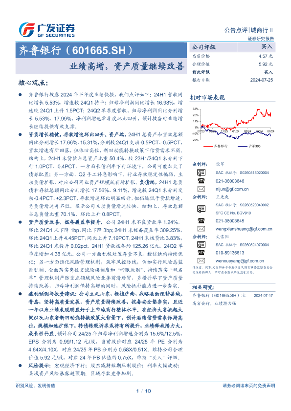 【广发证券】【20240725】齐鲁银行(601665)业绩高增,资产质量继续改善-10页