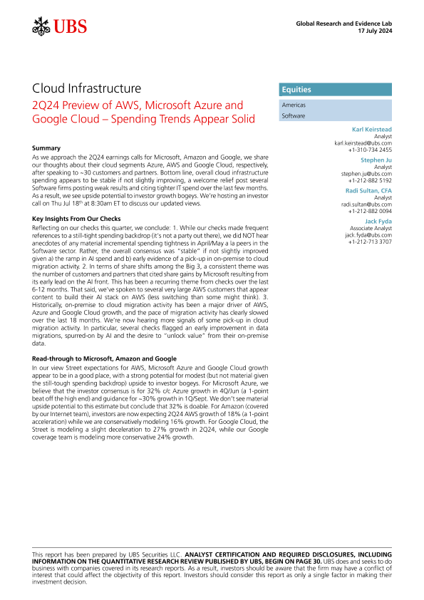 【UBS Securities LLC】【20240717】Cloud Infrastructure _2Q24 Preview of AWS, Microsoft Azure and Google Cloud – Spending Trends Appear Solid-41页