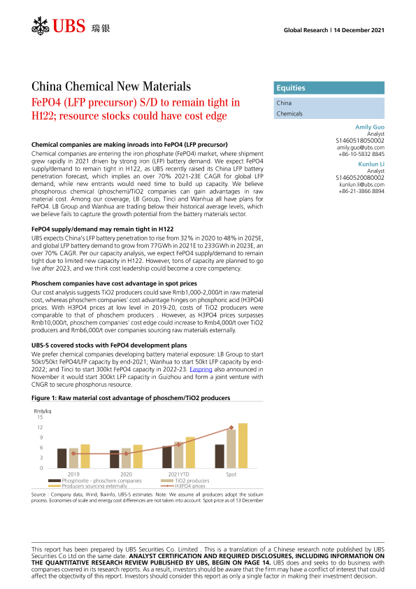 【瑞银】【20211214】瑞银-中国化学制品行业-FePO4(LFP前体)SD在2022年上半年中保持紧密;资源存量可能具有成本优势-23页