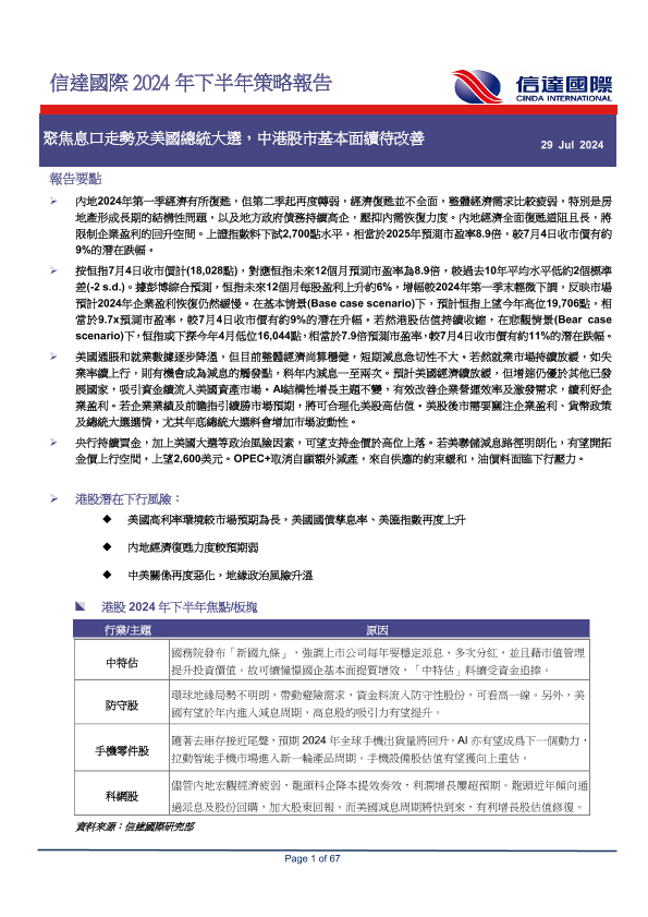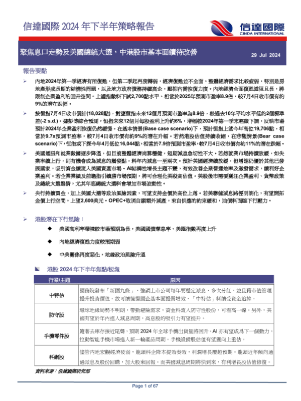 【信达国际】【20240729】2024年下半年策略报告:聚焦息口走势及美国总统大选,中港股市基本面续待改善-67页