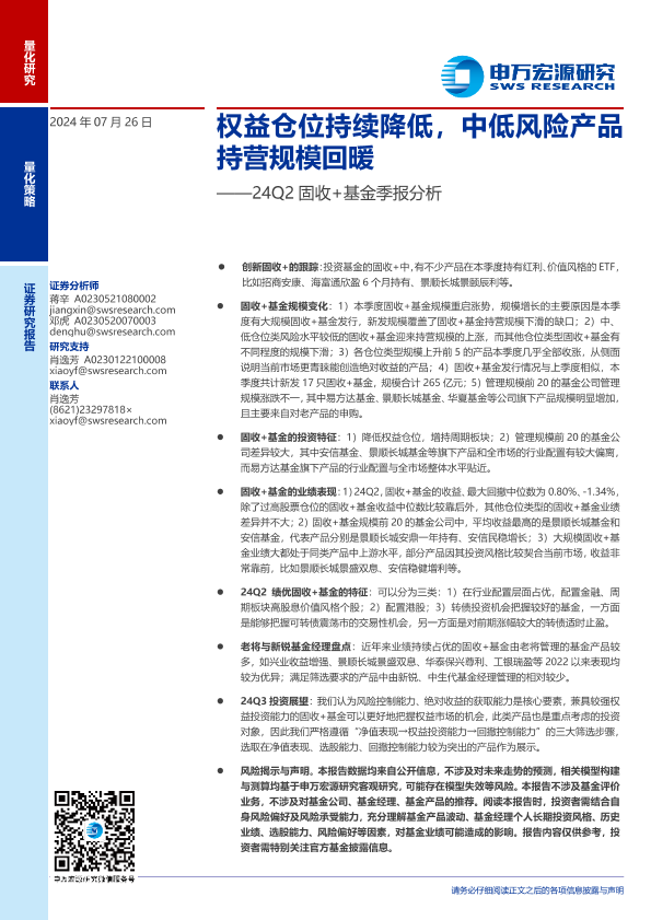 【申万宏源】【20240726】24Q2固收+基金季报分析:权益仓位持续降低,中低风险产品持营规模回暖-22页