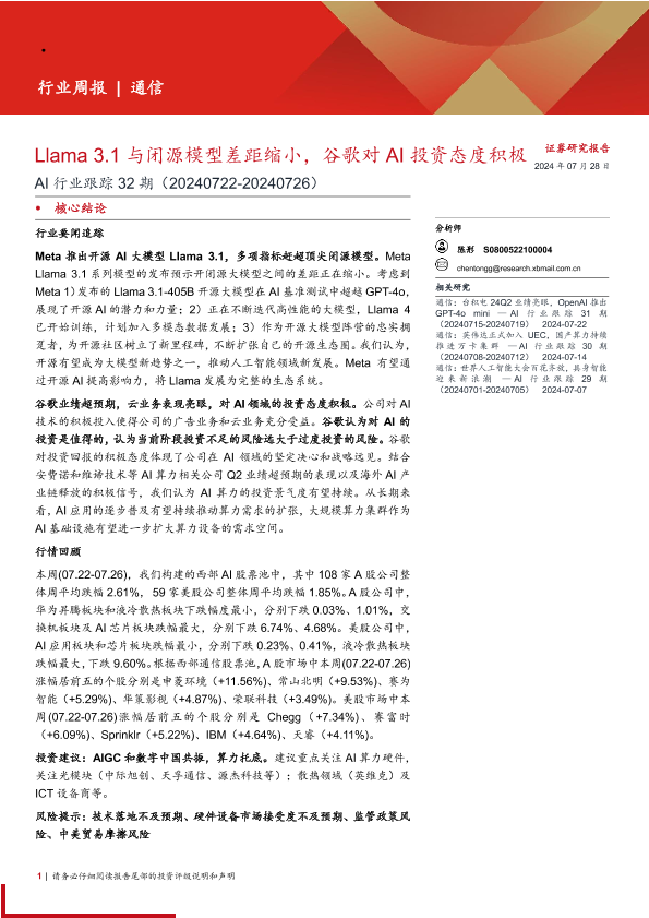 【西部证券】【20240728】AI行业跟踪32期:Llama 3.1与闭源模型差距缩小,谷歌对AI投资态度积极-13页