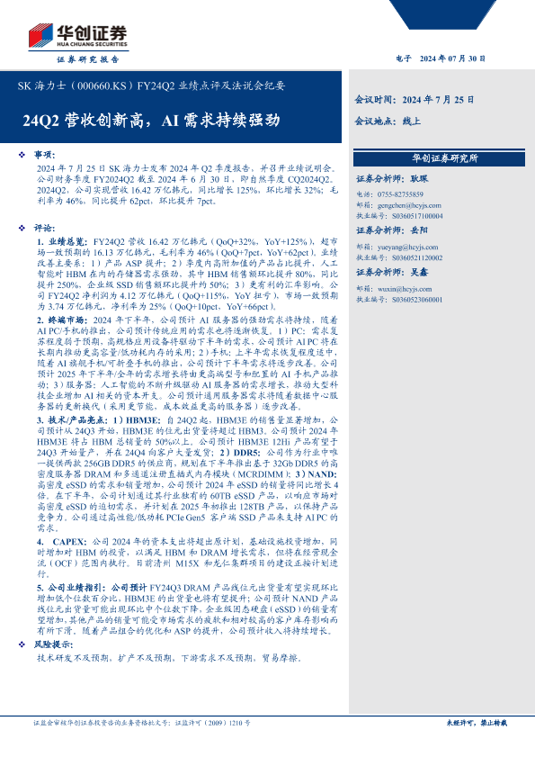 【华创证券】【20240730】SK海力士(000660)FY24Q2业绩点评及法说会纪要:24Q2营收创新高,AI需求持续强劲-14页