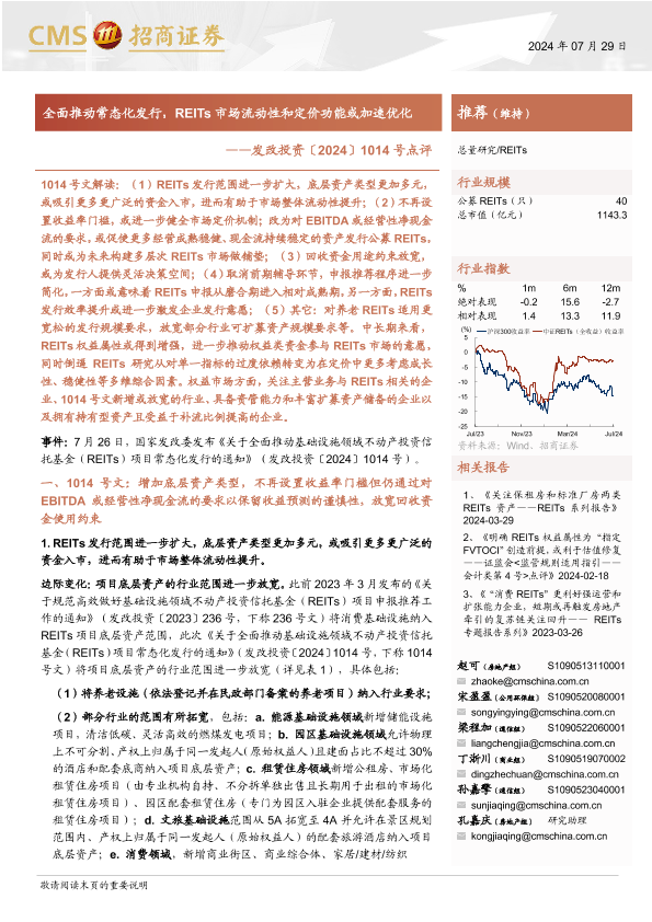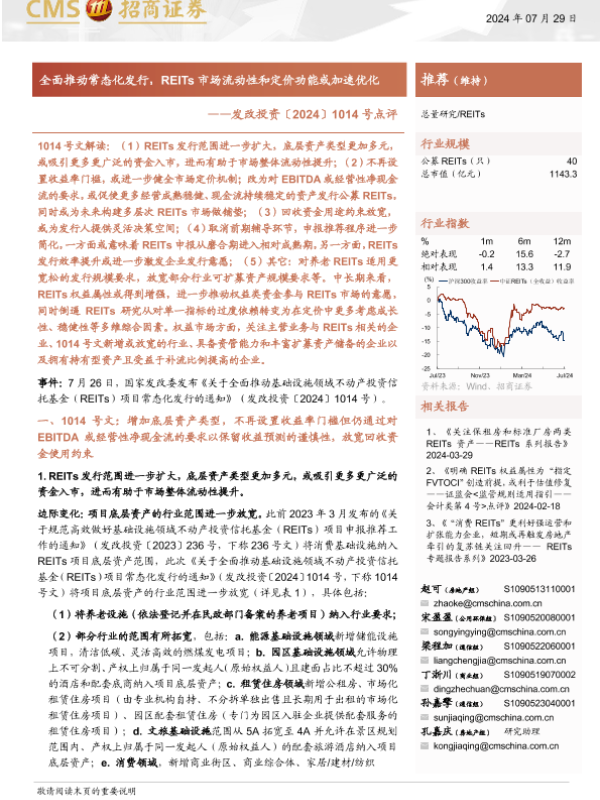 【海通证券】【20240729】REITs行业发改投资〔2024〕1014号点评:全面推动常态化发行,REITs市场流动性和定价功能或加速优化-10页