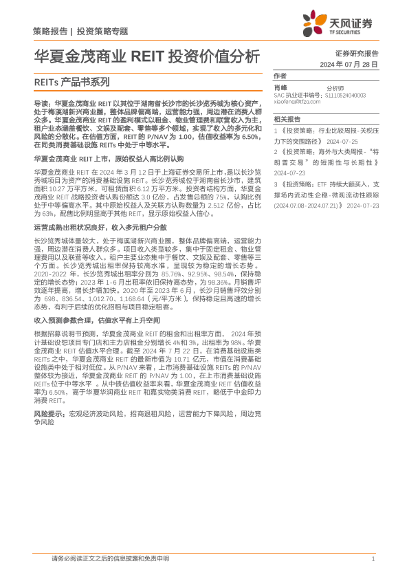 【天风证券】【20240728】REITs产品书系列:华夏金茂商业REIT投资价值分析-28页