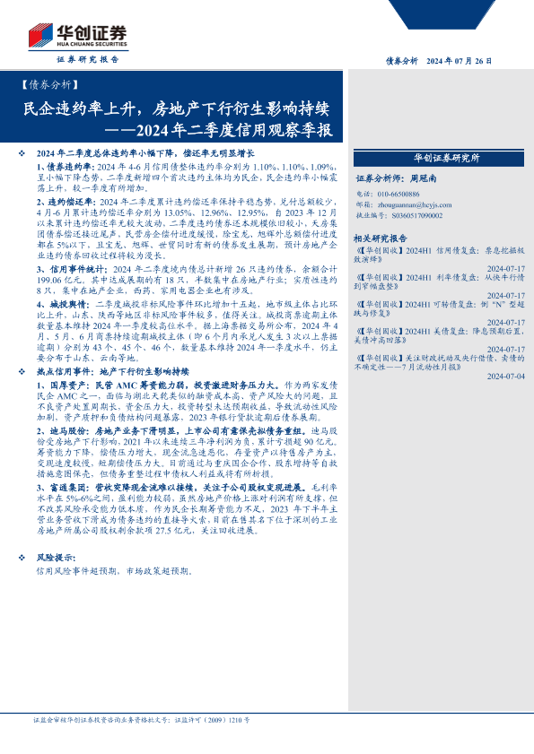 【华创证券】【20240726】2024年二季度信用观察季报:民企违约率上升,房地产下行衍生影响持续-17页