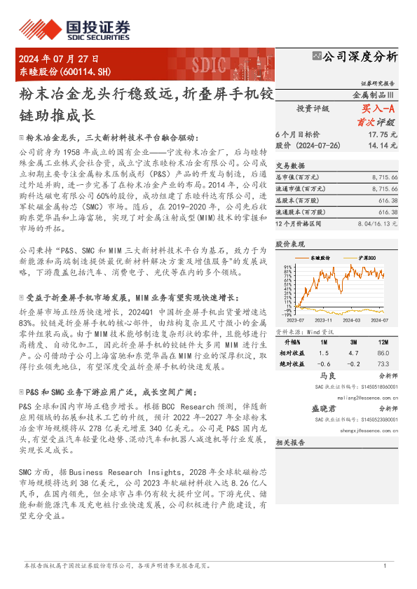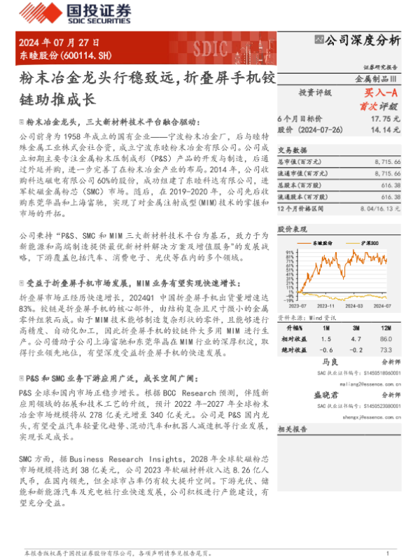 【国投证券】【20240727】东睦股份(600114)粉末冶金龙头行稳致远,折叠屏手机铰链助推成长-22页