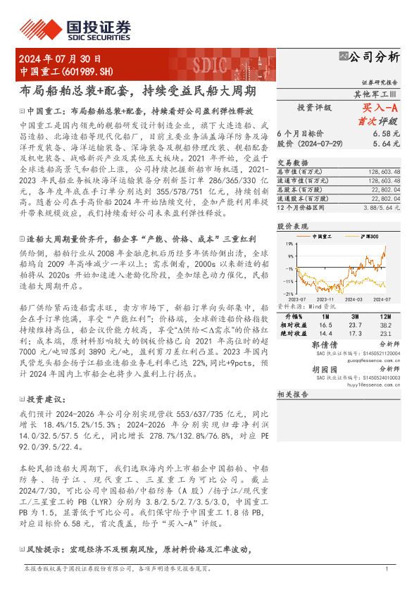 【国投证券】【20240730】中国重工(601989)布局船舶总装+配套,持续受益民船大周期-22页