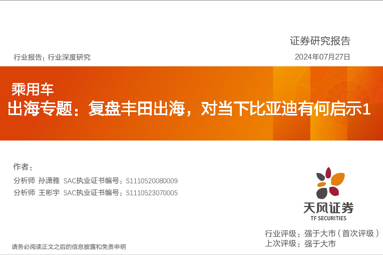 【天风证券】【20240727】乘用车行业出海专题:复盘丰田出海,对当下比亚迪有何启示-20页