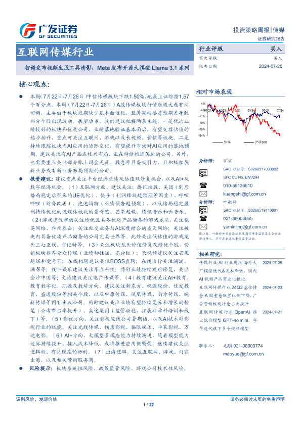【广发证券】【20240728】互联网传媒行业:智谱发布视频生成工具清影,Meta发布开源大模型Llama 3.1系列-22页