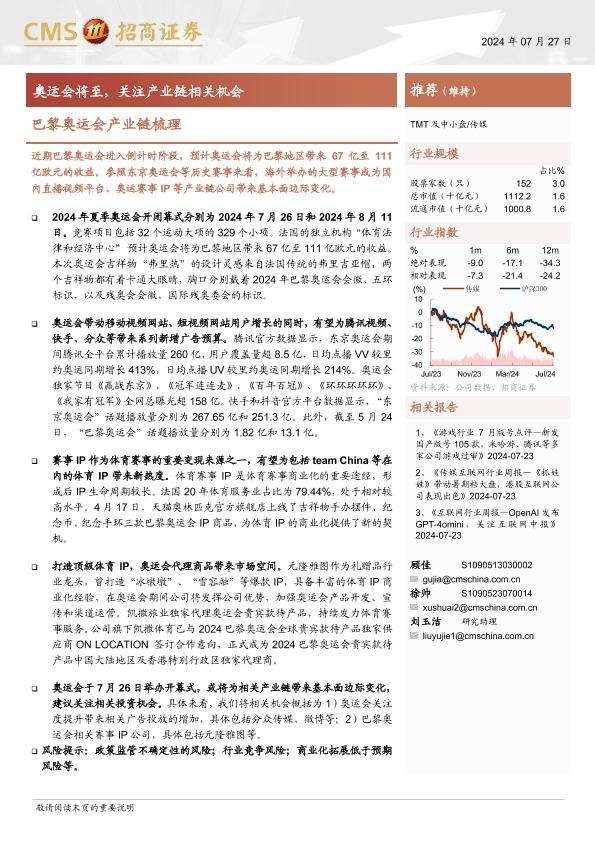 【海通证券】【20240727】传媒行业巴黎奥运会产业链梳理:奥运会将至,关注产业链相关机会-12页