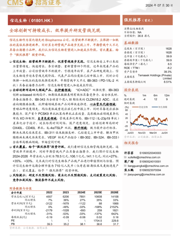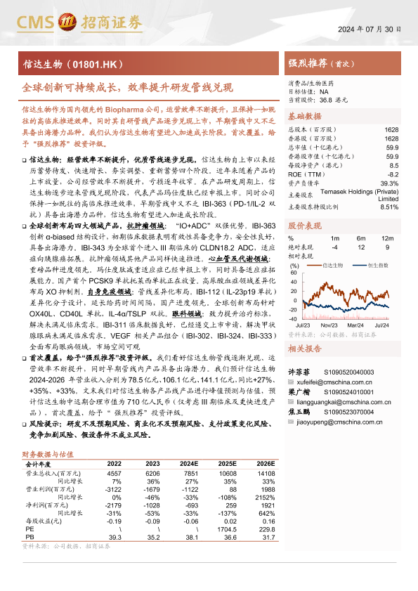 【海通证券】【20240730】信达生物(01801.HK)全球创新可持续成长,效率提升研发管线兑现-26页
