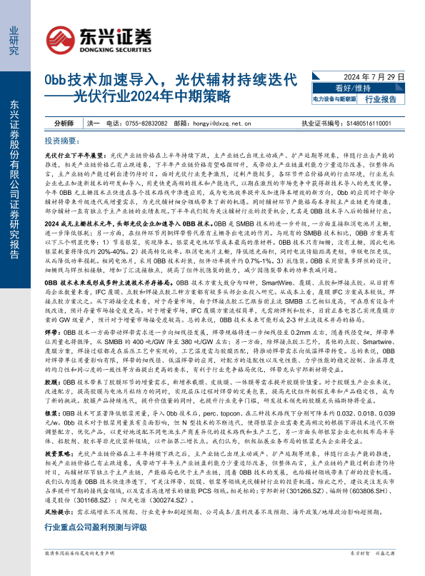 【东兴证券】【20240729】光伏行业2024年中期策略:0bb技术加速导入,光伏辅材持续迭代-17页