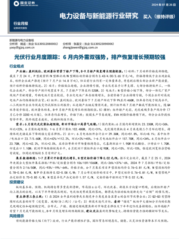 【国金证券】【20240726】光伏行业月度跟踪:6月内外需双强势,排产恢复增长预期较强-19页