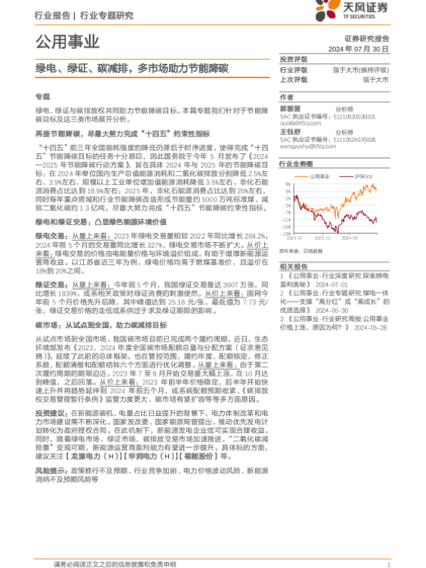 【天风证券】【20240730】公用事业行业报告:绿电、绿证、碳减排,多市场助力节能降碳-13页