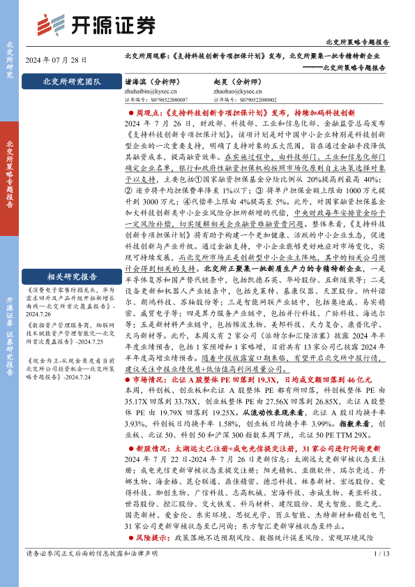 【开源证券】【20240728】北交所策略专题报告-北交所周观察:《支持科技创新专项担保计划》发布,北交所聚集一批专精特新企业-13页