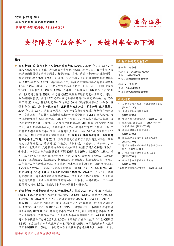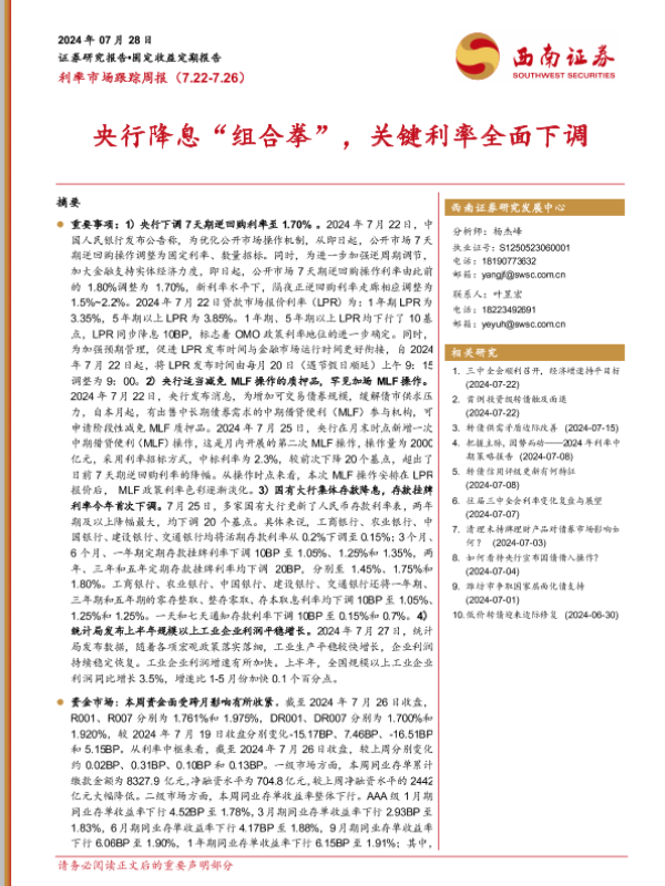 【西南证券】【20240728】利率市场跟踪:央行降息“组合拳”,关键利率全面下调-15页