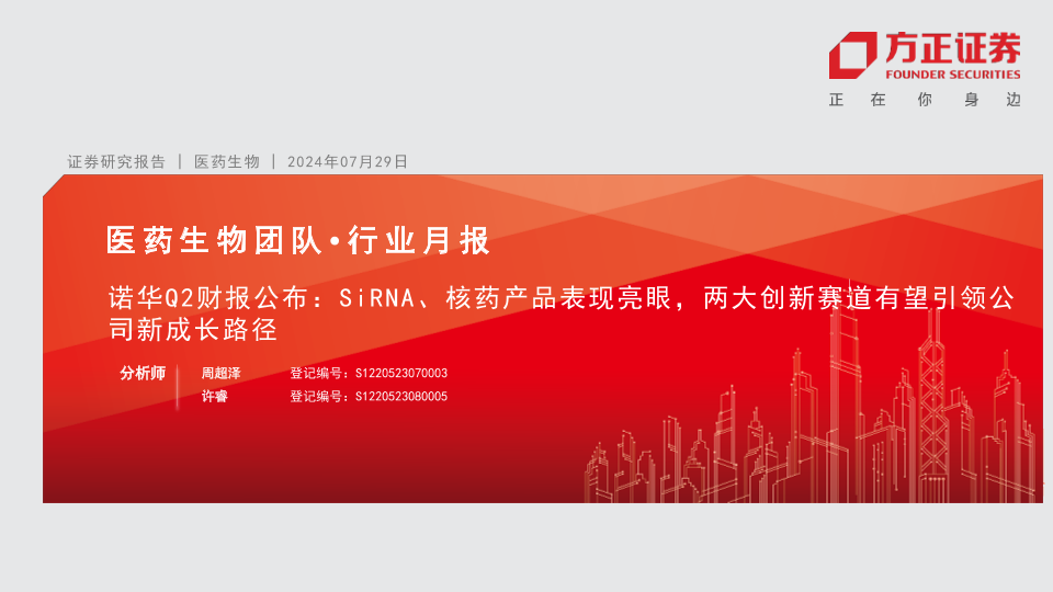 【方正证券】【20240729】医药生物行业-诺华Q2财报公布:SiRNA、核药产品表现亮眼,两大创新赛道有望引领公司新成长路径-10页