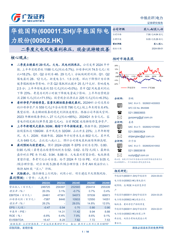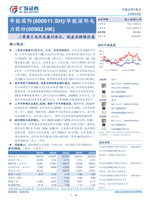 【广发证券】【20240801】华能国际(600011)二季度火电风电盈利承压,现金流持续改善-14页