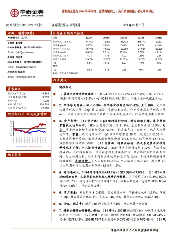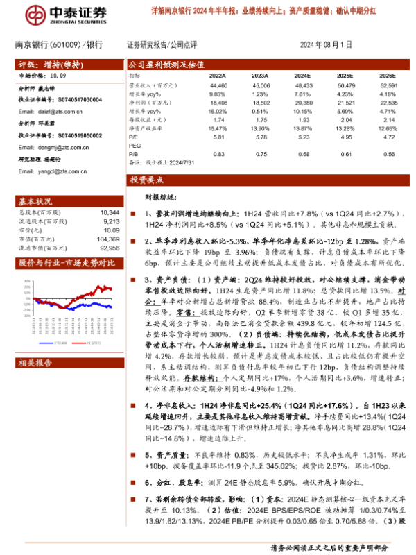 【中泰证券】【20240801】南京银行(601009)2024年半年报:业绩持续向上;资产质量稳健;确认中期分红-15页