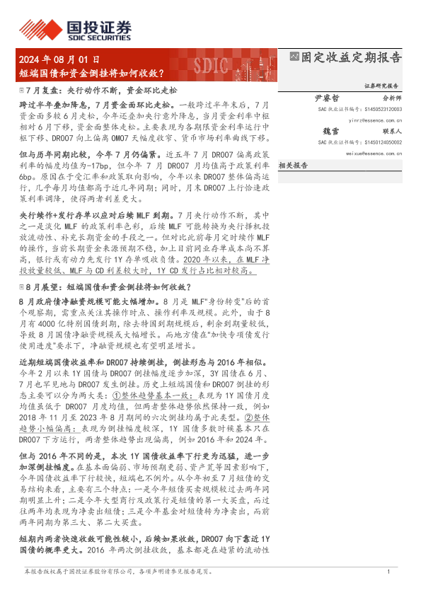 【国投证券】【20240801】固定收益定期报告:短端国债和资金倒挂将如何收敛?-13页