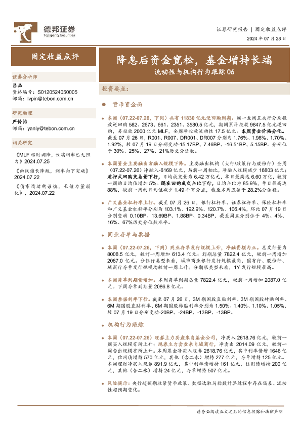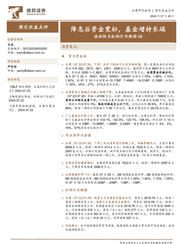 【德邦证券】【20240728】固定收益点评:流动性与机构行为跟踪06,降息后资金宽松,基金增持长端-18页