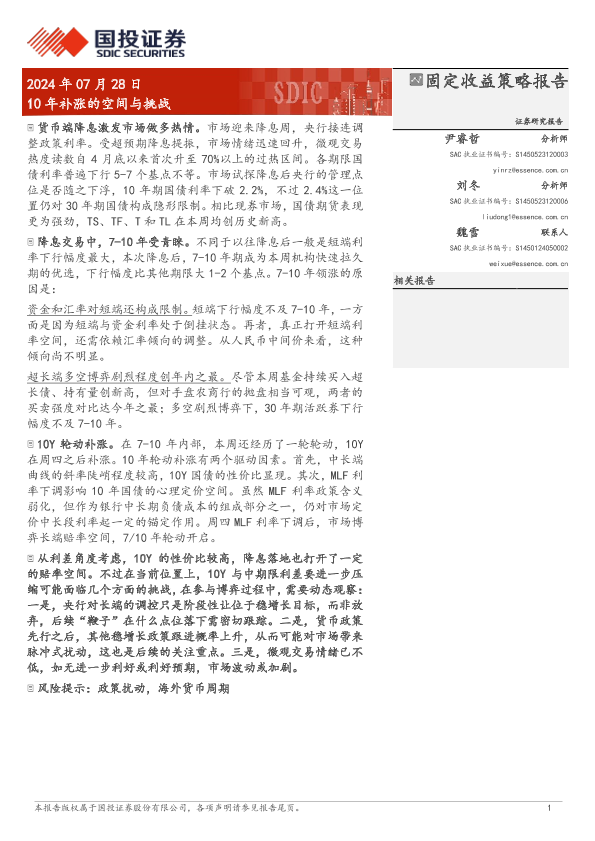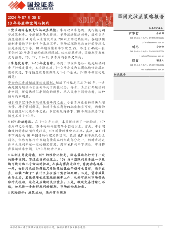 【国投证券】【20240728】固定收益策略报告:10年补涨的空间与挑战-10页