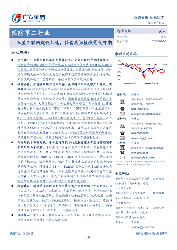 【广发证券】【20240730】国防军工行业:卫星互联网建设加速,供需共振板块景气可期-18页