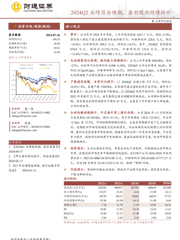 【财通证券】【20240728】宁德时代(300750)2024Q2业绩符合预期,盈利能力持续提升-13页