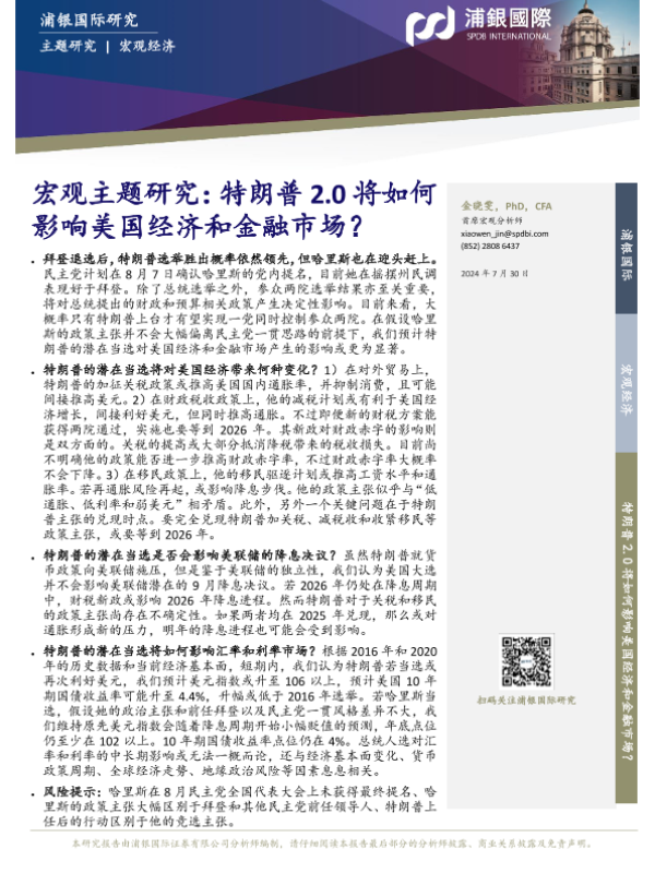【浦银国际】【20240730】宏观主题研究:特朗普2.0将如何影响美国经济和金融市场?-15页
