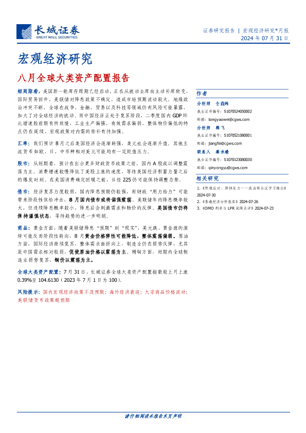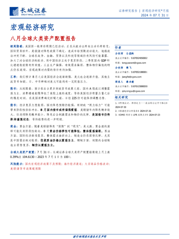 【长城证券】【20240731】八月全球大类资产配置报告-18页