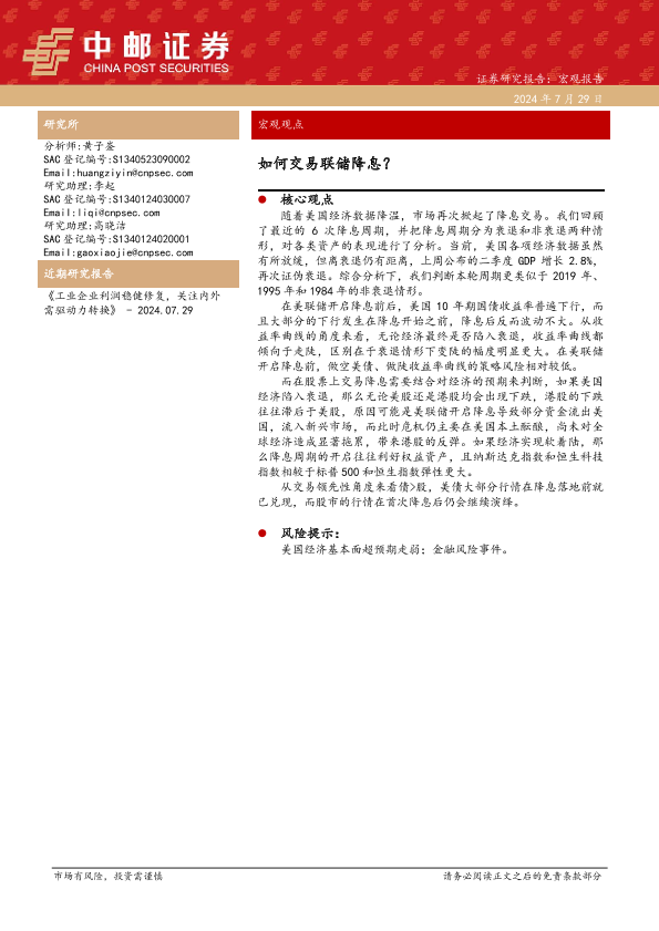 【中邮证券】【20240729】宏观观点:如何交易联储降息?-15页